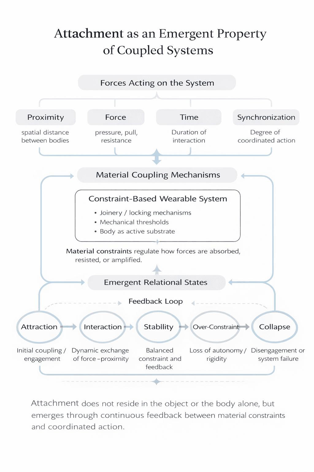 Attachment becomes a system governed by constraint, force and coordinated action. The project uses wearables to show relational states when bodies and materials become mechanically interdependent.