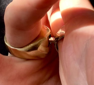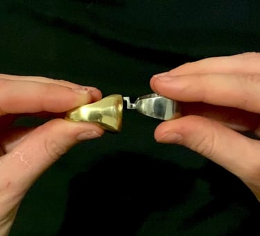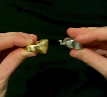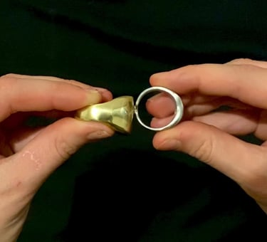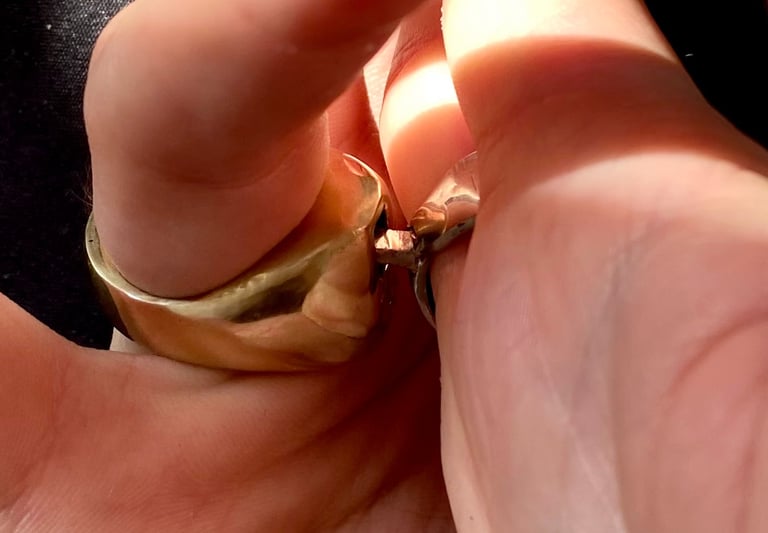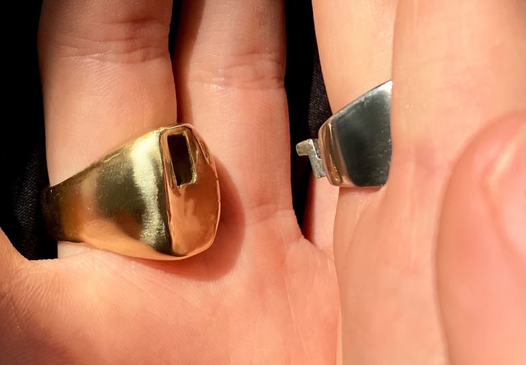 Once I found a suitable one, I carved the rings using green wax. I worked in three heat-bonded layers to create the undercut in the lock. Both rings were sanded and cast in brass: The male in yellow brass and the female in white brass.
