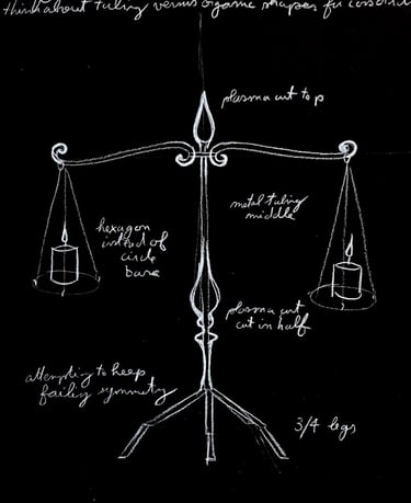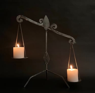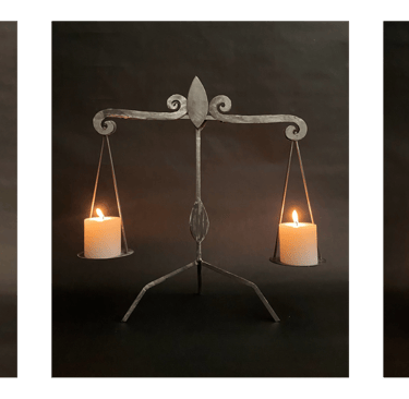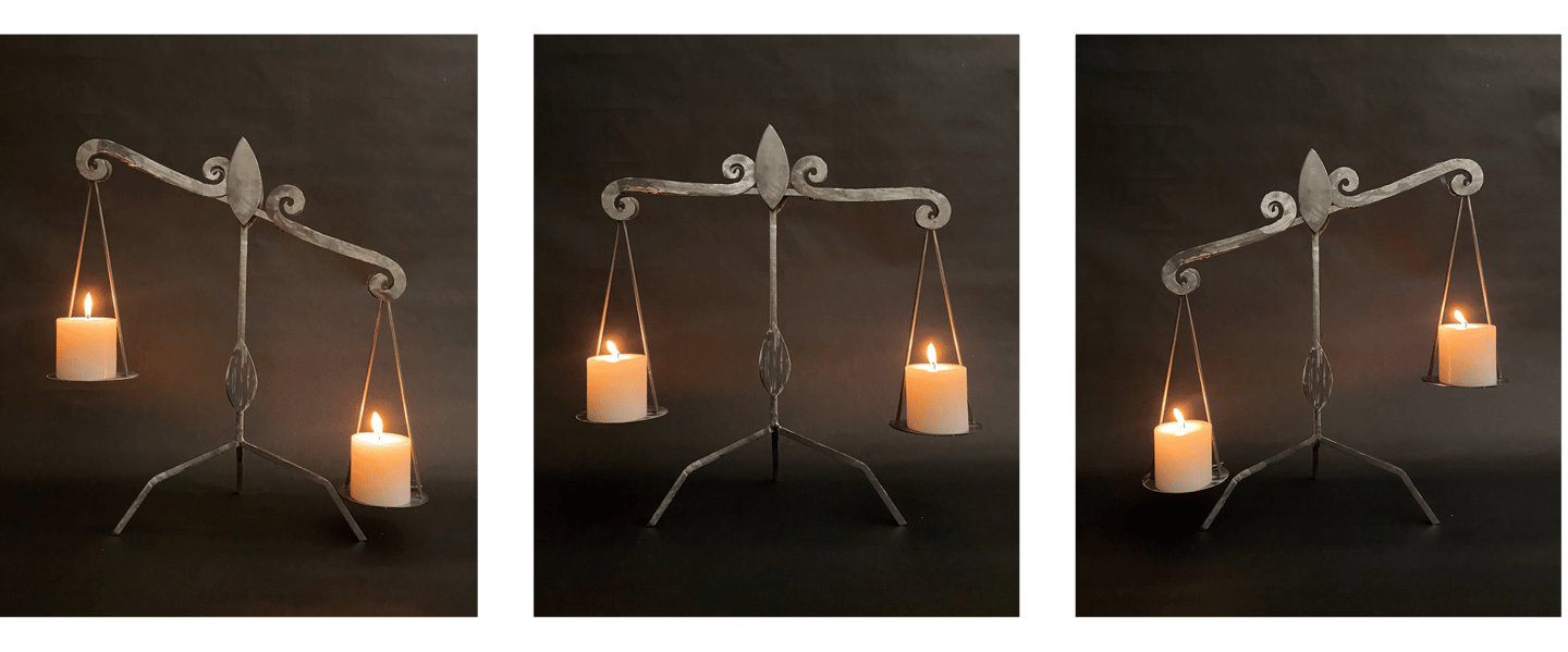 "Equal Love" is a kinetic sculpture that explores the weight and imbalance of human affection. Gravity, motion, action and consequence is illustrated through a weighting mechanism. Two candles rest on a scale of hand-forged steel: when one rises, the other falls. As the flames burn unevenly, the structure shifts. Together, they create a dialogue between surrender and power. What falls can lift