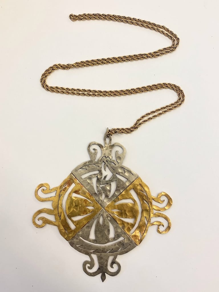 Transform metal quilt into a necklace through incorporating chains to design allowing it to be worn