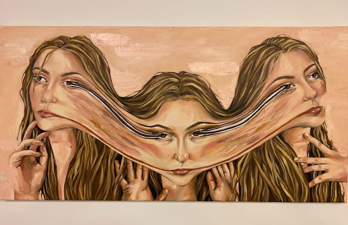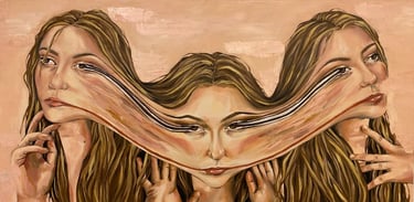 My aim was to produce a self portrait ripping itself apart through loosely connected heads. After investigating Gogh’s use of distorted brush stroked in his oil painting, I noticed the presence of continual distortions in the world around me: sound waves, water, and the mind. I began exploring how distortion in the self can be manifested through the visual language. A specific type of distortion, mitosis, had a prominent impact on my work. Especially, the exact moment cells are in the process of dividing and stretch out from each other while still being connected. Mitosis is also thematically significant as it can refer to birth, evolution, development and carbon based life as a whole.